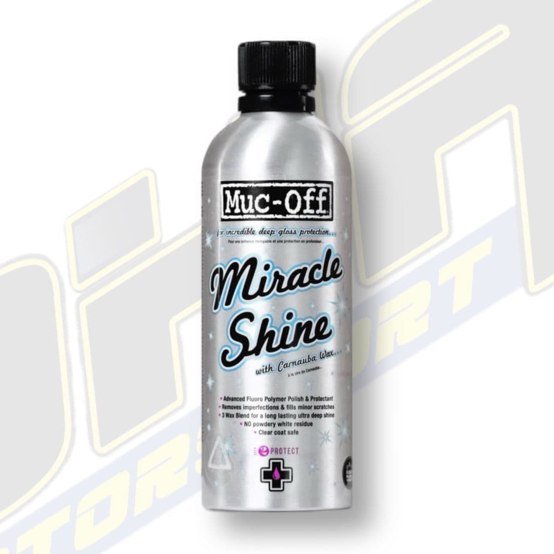 Let’s not beat around the bush, you want a high quality polish and protectant that delivers a deep and luxurious shine for your bodywork or frame, Muc-Off Miracle Shine is the product for that job. Not only does our Miracle Shine give you amazing reflective results – but it also covers the treated areas with a microscopic protective layer against atmospheric pollutants, thanks to it’s Fluoro Polymer Technology! Our luxurious polish also includes Carnauba Wax as well as other highly advanced ingredients so that your paintwork is treated with love and respect. So if you want your paint finish to gleam like new, make the water bead away furiously and make the car easier to clean next time, Muc-Off Miracle Shine is the product for you.